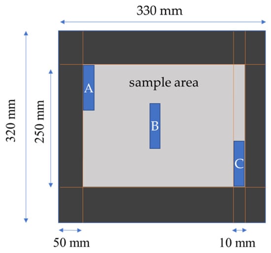 The geometry of sample plates. A, B, and C: areas for void content and fiber volume fraction. Grey area: area for tensile and bending specimens.