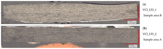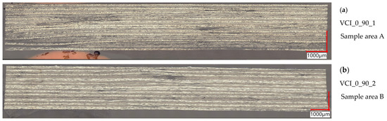 The average void content values are low for both processes: VCI is −0.02% and VAP is 1.41%, with the lowest single value for VCI at −0.66%. Taking an absolute error of ±1% into regard, the values are in the uncertainty range of the method. To prove that the void content is close to 0%, respectively, in the range of the measured values, cross-sections from all plates at all sample spots A, B, and C are taken. Figure 5, Figure 6 and Figure 7 display representative pictures from each configuration. The cross-sections show that for both process variations, only very few voids can be observed, which correlates with the measured void content values. Single samples show a local accumulation of voids. On average, the VCI process shows a lower absolute fiber volume fraction, with an average of 39.0%, compared to 45.2% for the VAP process. The deviation for VCI of ±2.7% is lower than that for VAP with ±3.7%. The densities of all laminates are in the range of 1.38–1.43 g/m3. The single values correlate with the corresponding FVF and void content values. The standard deviations are all in the typical range for the used method.