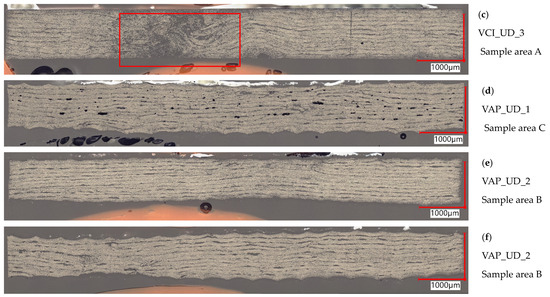 Representative cross-sections of the unidirectional configurations. Magnification: 250×, (a) VCI_UD_1 sample area B, (b) VCI_UD_2 sample area A, (c) VCI_UD_3 sample area A, (d) VAP_UD_1 sample area C, (e) VAP_UD_2 sample area B, (f) VAP_UD_2 sample area B.