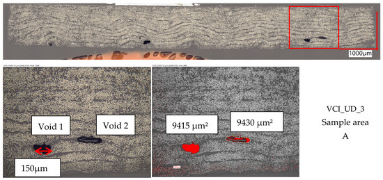 For one representative sample, a reference measurement is performed on the specimen of the plate VCI_UD_3 (sample area A). A local reference area has been defined conservatively with a size of 1 mm2. The areas of the identified voids are determined and set in relation to the reference area (see Figure 6). The measurement results in a local void content of 1.88%. The result is higher than the overall measured value of −0.66%. The result shows that the overall and the local void content is lower than 2%, which is in the range of a high-performance laminate [26].