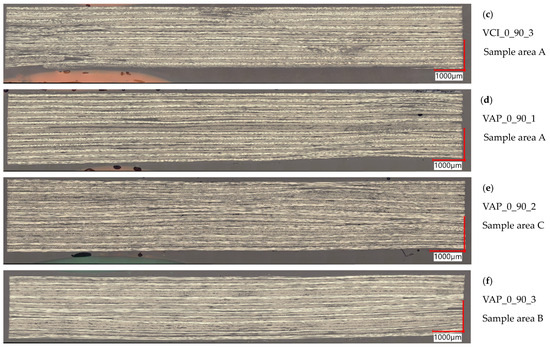 Representative cross-sections of the 0/90° configuration magnification 250×, (a) VCI_0_90_1 sample area A, (b) VCI_0_90_2 sample area B, (c) VCI_0_90_3 sample area A, (d) VAP_0_90_1 sample area A, (e) VAP_0_90_2 sample area C, (f) VAP_0_90_3 sample area B.