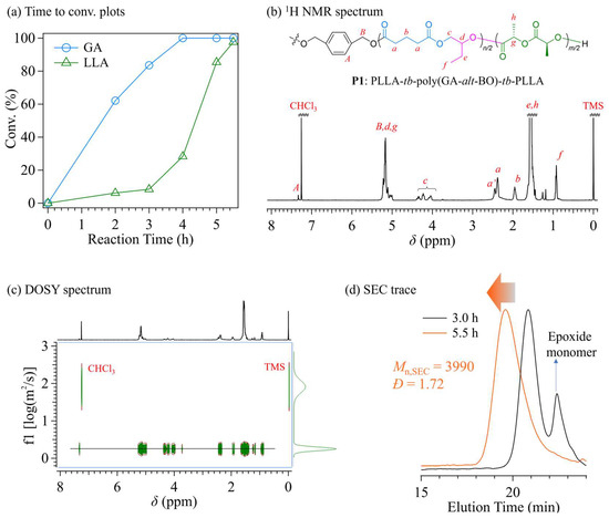 Characterization of P1. (a) Time to conv. plots monitored by 1H NMR. (b) 1H NMR and (c) DOSY spectrum in CDCl3. (d) SEC traces of the product withdrawn at 3.0 h and the final product (5.5 h) (eluent, THF; flow rate, 1.0 mL min−1). Signal a′ of 1H NMR corresponding to the proton signal from the GA unit adjacent to the LLA unit.