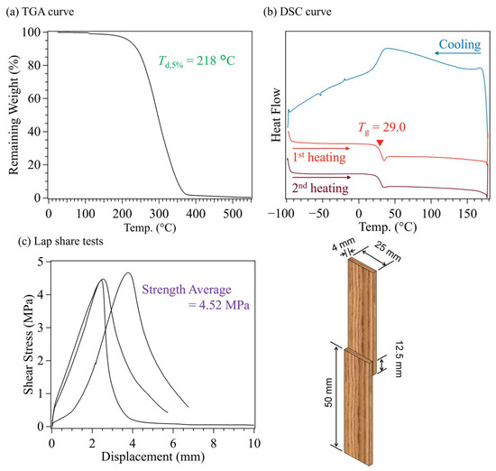 Physical properties of P1: (a) TGA curve (heating ratio, 10 °C min−1; nitrogen atmosphere). (b) DSC thermogram detected during heating/cooling/heating scan (1st heating: −100–180 °C, 1st cooling: −100–180 °C, 2nd heating: −100–180 °C; 10 °C min−1; N2 atmosphere). (c) Lap share tests using wood pieces (adherent, wood; tensile speed = 10 mm min−1; n = 3).
