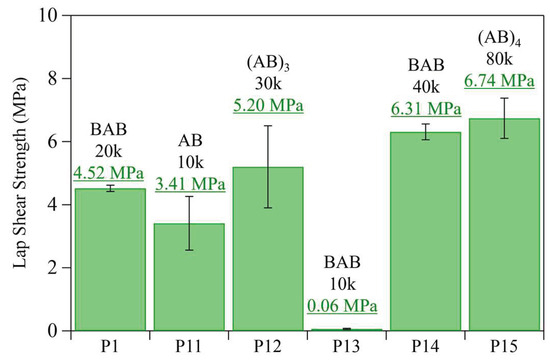 Based on these results, a four-armed (AB)4-type copolyester with the highest molecular weight (Mn,theo. of 79,200) and FLLA of 0.79 was synthesized using a tetraol, i.e., pentaerythritol (PEOL), as an initiator with the initial feed ratio of [CsOPiv]/[PEOL]0/[GA]0/[BO]0/[LLA]0 = 1/1/84/336/440 (P15 in Table 2). As expected, the adhesive strength of P15 (6.74 MPa) was the highest among all the tested samples (Figure 4). Importantly, the adhesive strength of P15 was comparable to that of commercially available PE and PVAc adhesives [29] (Figure 5).