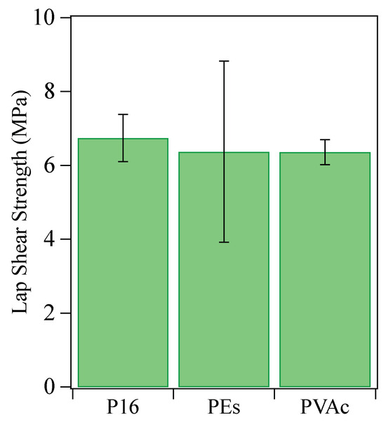 Lap shear strength of P15 compared to commercial polyester (PE; PES-111, Toagosei) and poly(vinyl acetate) (PVAc; ref. [32]) adhesives (adhesion, wood; tensile speed = 10 mm min−1; n = 3).