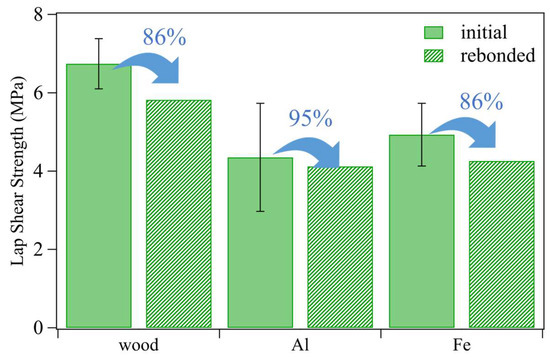 Lap shear strength of P15 adhered wood, Al, and Fe pieces for both initial (n = 3) and rebounded (n = 1) samples. The test was conducted at a tensile speed of 10 mm min−1.