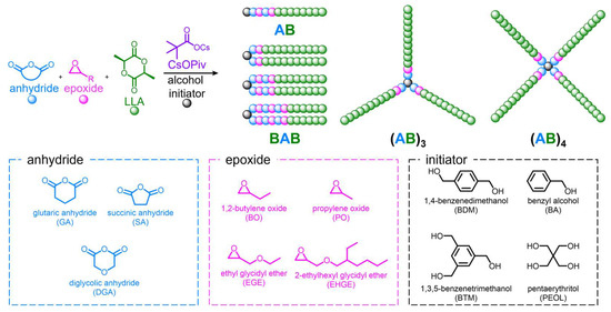 L-Lactide (LLA; >98.0%, Tokyo Kasei Kogyo Co., Ltd. (TCI), Tokyo, Japan) was purified by recrystallizing it from dry toluene twice. 1,2-Butylene oxide (BO; >99.0%, TCI), 2-ethylhexyl glycidyl ether (EHGE; >98.0%, TCI), and ethyl glycidyl ether (EGE; >98.0%, TCI) were distilled over CaH2 under reduced pressure and stored under argon atmosphere. Propylene oxide (PO; >99.0%, TCI) was distilled over CaH2 and stored under argon atmosphere. Succinic anhydride (SA; >95.0%, TCI), diglycolic anhydride (DGA; >98.0%, TCI), and glutaric anhydride (GA; >98.0%, TCI) were purified by sublimation under reduced pressure. Cesium pivalate (CsOPiv; >97.0%, TCI) was dried by heating at 100 °C under high vacuum for at least 72 h before use. Benzyl alcohol (BA; >99.0%, TCI), 1,4-benzenedimethanol (BDM; >99.0%, TCI), 1,3,5-benzenetrimethanol (BTM; >95.0%, TCI), and pentaerythritol (PEOL; >98.0%, TCI) were used as received.