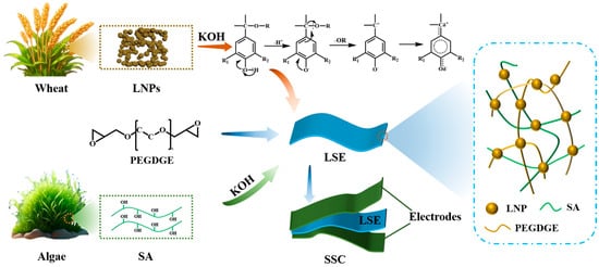 The schematic representation for the fabrication of the LSE is illustrated in Figure 1. Initially, LNPs derived from wheat straw through deep eutectic solvent (DES) extraction can be effectively dissolved in a KOH solution. Under alkaline conditions, LNPs become fully activated, resulting in the formation of a methylene quinone structure (–C4–O−), which enhances the surface reactivity of lignin. Notably, the presence of negatively charged oxygen ions serves as a potent activating group, which facilitates the activation of the benzene ring, thereby improving the hydrophilicity of the lignin molecule and increasing its solubility []. Furthermore, the oxygen atom within the epoxy group of poly (ethylene glycol) diglycidyl ether (PEGDGE) exhibits low reactivity, rendering it regioselective under strong alkaline conditions []. The Cα position on the lignin structure acts as a site for nucleophilic attack [] leading to further interaction with the epoxy group of PEGDGE and initiating a ring-opening reaction. Following the cleavage of the epoxy ether bond, LNPs engage in a molecular cross-linking reaction with PEGDGE, while SA contributes to the formation of a homogeneous 3D network structure within the reaction solution. This network is established through molecular chain entanglement and interactions, such as hydrogen bonding [], which facilitate rapid ion transport by shortening the transport distance []. In the preparation process, LNPs serve as the polymeric molecular backbone, SA functions as the network-enhancing matrix, and PEGDGE acts as the cross-linking agent, collectively enabling the development of binary LNP/SA-based solid-state electrolyte films (LSE).
