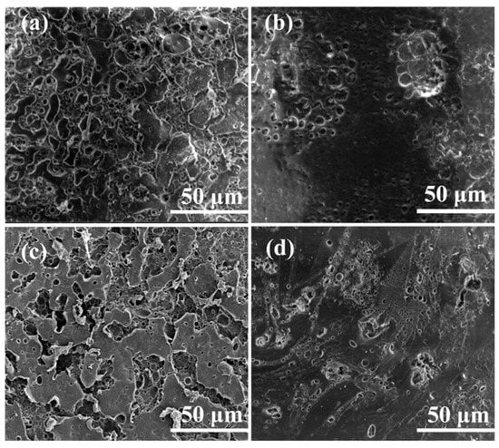 The SEM images of the LSE with varying concentrations of SA are presented in Figure 2. As the concentration of SA increased (Figure 2a–c), the number of pores within the LSE became more abundant and uniformly distributed, while the degree of cross-linking among the pores also intensified. This phenomenon can be attributed to the solubilization of hydroxyl-rich long-chain SA within the reaction system, which facilitates the intertwining of SA molecular chains and the establishment of a 3D network through intermolecular interactions, such as hydrogen bonding. Consequently, this leads to an increase in the flow resistance of the system []. However, when the SA concentration reaches 20% (Figure 2d), a decrease in pore size and a significant reduction in number of pore channels are observed. This reduction is ascribed to the excess SA, which elevates the viscosity of the reaction system and impedes the movement of the reaction components, thereby hindering the polymerization process.