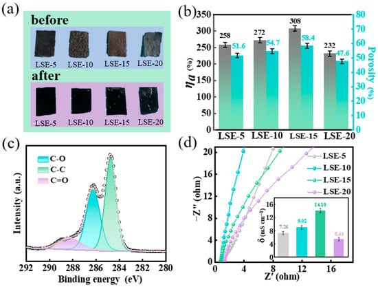 (a) Graphical comparisons of the LSE before and after immersion in a 3.3 M KOH solution for 4 h; (b) porosity and electrolyte absorption capacity (ηa); (c) C 1s XPS spectra of LSE-15; (d) EIS curves and the ionic conductivity (δ) of the LSE.