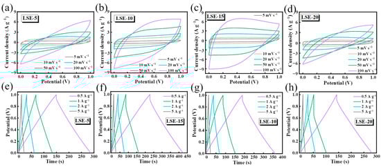 CV curves of (a) LSE-5, (b) LSE-10, (c) LSE-15, (d) LSE-20 at different scan rates; GCD curves of (e) LSE-5, (f) LSE-10, (g) LSE-15, (h) LSE-20 at different current densities.
