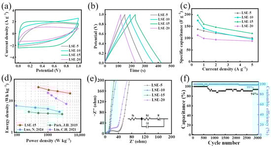 The CV curves of all LSE-based SSC devices obtained at a scan rate of 20 mV s−1 and their GCD curves recorded at a current density of 0.5 A g−1 are presented in Figure 5a,b, respectively. It is evident that the SSC devices constructed from LSE-15 exhibit the highest response current and the largest enclosed area under the CV curve (Figure 5a), indicating that it possesses the greatest specific capacitance. This superior performance can be attributed to the high electrolyte absorption, porosity, and ionic conductivity of LSE-15, which facilitate adequate ion transport and transfer during the charging/discharging processes of the SSC. A notable variation in discharge time for the SSC is observed in Figure 5b. The SSC assembled from LSE-15 demonstrates the longest discharge time, further corroborating its largest specific capacitance, which aligns with the findings from the CV curve analysis. The specific capacitances of the SSCs constructed from LSE-5, LSE-10, LSE-15, and LSE-20 were measured at 134 F g−1, 175 F g−1, 197 F g−1, and 115 F g−1, respectively, at a current density of 0.5 A g−1 (Figure 5c). It is observed that the specific capacitance of the SSC decreases with increasing current density, a phenomenon attributed to the deterioration of charge transport caused by restricted ion diffusion at the electrode/electrolyte interface under high current density conditions, leading to a reduction in specific capacitance []. Nevertheless, the SSC device assembled from LSE-15 maintains a commendable specific capacitance of 120 F g−1 even at a high current density of 5 A g−1, suggesting its capability to deliver high energy density at elevated charge/discharge rates. The Ragone plots (Figure 5d) indicate that the energy storage capacity of our SSC device exceeds that of previously reported devices [,,]. Specifically, the SSC constructed with LSE-15 achieved a high energy density of 27.33 W h kg−1 at a power density of 500 W kg−1. Remarkably, even as the power density escalated to 4998 W kg−1, the energy density of the SSC remained at 17.22 W h kg−1.
