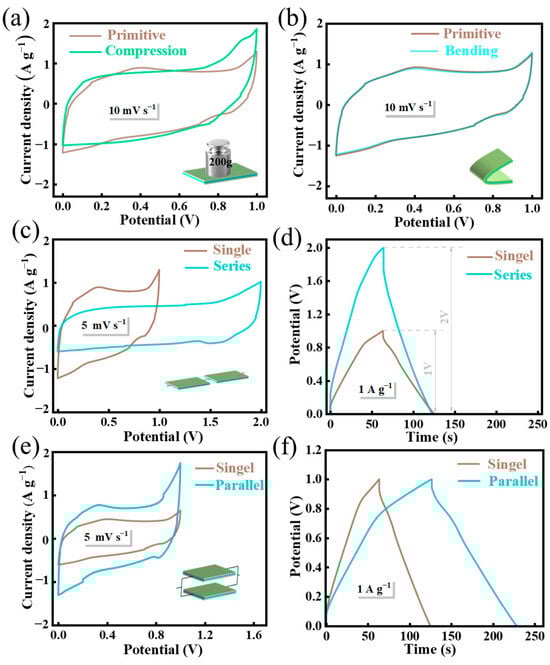 CV curves of the SSC under compression (a) and bending (b) conditions; the CV (c) and GCD (d) curves of two SSCs in series; the CV (e) and GCD (f) curves of two SSCs in parallel.