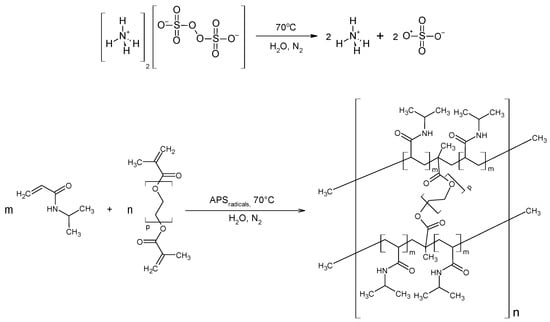 Polymerization reaction scheme of NIPA with PEGDMA under the experimental conditions employed in this study, together with the suggested polymer structure.