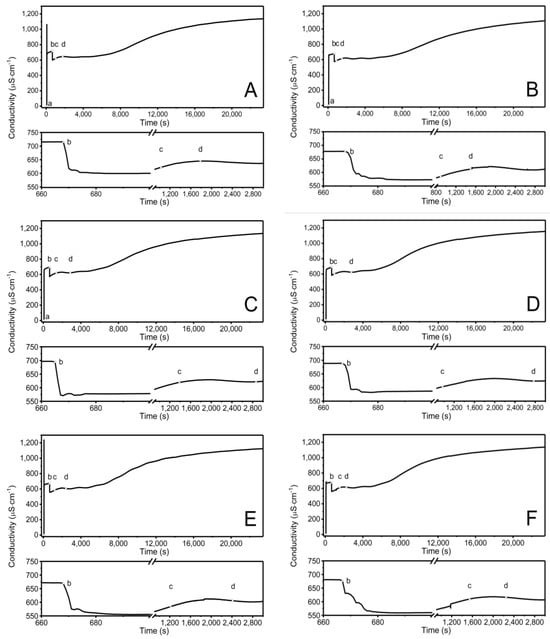 Conductivity changes observed in the reaction systems in the course of synthesis of P1 (A), P2 (B), P3 (C), P4 (D), P5 (E), P6 (F) polymers at T = 70 °C. Point (a) determines the moment of addition an initiator−APS, point (b) the addition of the aqueous solution of the monomers−NIPA and appropriate PEGDMAs, point (c) the beginning of visible change in cloudiness of the reaction mixture, point (d) the complete turbidity of the reaction mixture.