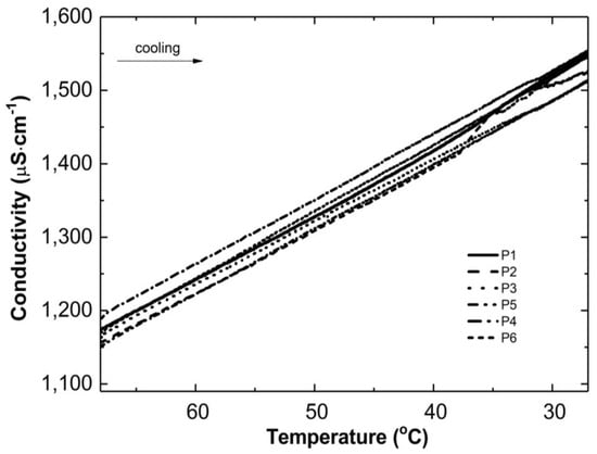 Conductivity changes versus temperature in the post-reaction mixtures of P1–P6 during the cooling process.