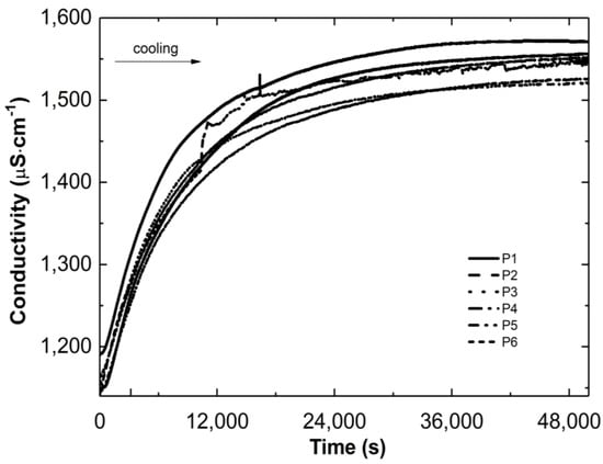 Conductivity changes versus time in the post-reaction mixtures of P1–P6 during the cooling process.