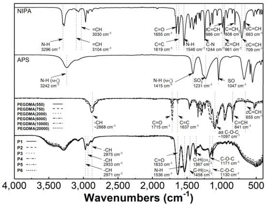 The monomers NIPA and five PEGDMAs, the initiator APS, and the synthesized polymers P1–P6 were characterized using ATR-FTIR spectroscopy. Figure 5 displays the typical ATR-FTIR spectra of the substrates and products, with characteristic bands labelled. The spectra of NIPA and APS have been previously described in detail in our studies [52].