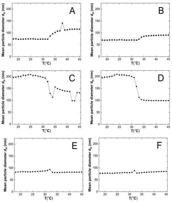 The changes in hydrodynamic diameter vs. temperature of the P1 (A), P2 (B), P3 (C), P4 (D), P5 (E), P6 (F) samples, determined by dynamic light scattering.