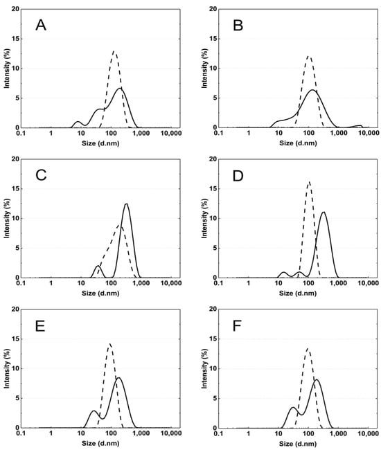 The particle size distribution by intensity for P1 (A), P2 (B), P3 (C), P4 (D), P5 (E), and P6 (F) dispersions at 18 °C—solid line and 45 °C—dash line, obtained from dynamic light scattering (DLS) analysis.