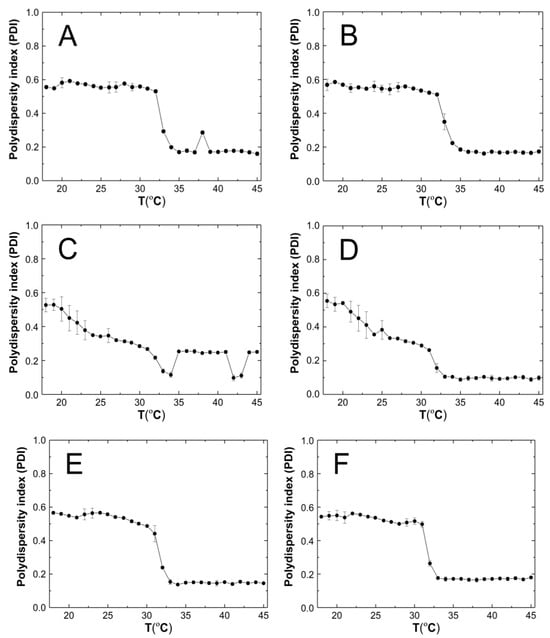 The polydispersity index (PDI) of the tested systems was measured during the particle size measurements. Five PDI measurements were taken at one temperature ranging from 18 to 45 °C. The PDI values at one temperature were averaged and the standard error calculated. Figure 8A–F show the variation of the PDI values for the purified aqueous dispersions of P1–P6 polymers as a function of temperature.
