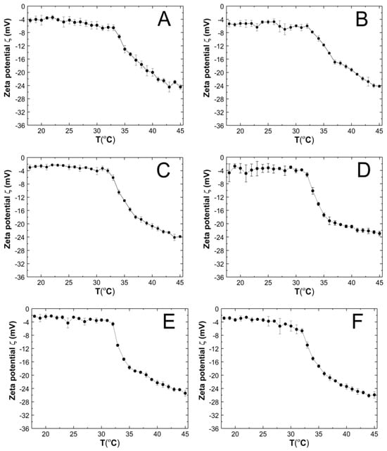 Zeta potentials (ZPs), also known as electrokinetic potentials, were measured for a purified aqueous dispersion of P1–P6 polymers over a temperature range of 18–45 °C. Five measurements were taken for each temperature, and the average value was calculated along with the corresponding standard error. Figure 9A–F illustrate the temperature-dependent changes in ZP. The samples were measured without buffering, and their pH values were measured at approximately 22.5 °C as follows: 6.2, 6.3, 5.7, 6.3, 6.3, and 6.7 for the P1, P2, P3, P4, P5, and P6 polymer dispersions, respectively.
