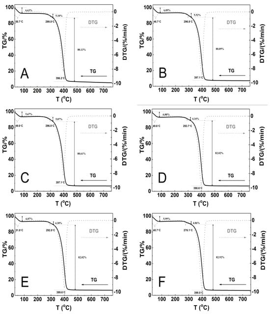 The polymeric material’s thermal stability was assessed by measuring mass changes between 25 and 800 °C. Figure 10A–F show the TGA and first derivative thermal analysis (DTA) plots, while Table 2 provides the TGA and DTA curve analysis results for all six polymers evaluated.