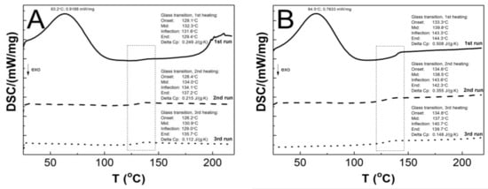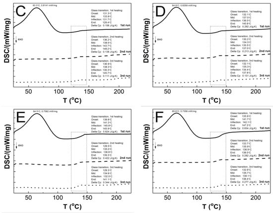 Figure 11A–F present a comparative analysis of the thermal profiles of the first (solid line), second (dashed line), and third (dotted line) heating runs of the P1–P6 samples. All of the curves generated by the first heating cycle exhibit two endothermic effects, the broad endothermic peak at approximately 64.3 °C and a less pronounced endothermic event at around 137.7 °C. In the curves generated in the second and third stages, no endothermic peak was detected, and only one endothermic effect was visible. The glass transition temperatures Tg obtained from DSC studies of the first, second, and third run heat were 132.3/134.0/130.9; 139.8/138.5/137.3; 133.9/138.5/138.3; 137.0/134.3/135.3; 141.3/135.0/134.6; 141.7/135.9/135.7 °C, for the P1, P2, P3, P4, P5, and P6 respectively. The first, second, and third runs of heating yielded the following ∆Cp values: 0.249/0.215/0.112; 0.508/0.355/0.148; 0.156/0.138/0.111; 0.292/0.213/0.131; 0.624/0.422/0.344; 0.834/0.282/0.277 J·g−1·K−1 for P1, P2, P3, P4, P5, and P6, respectively.