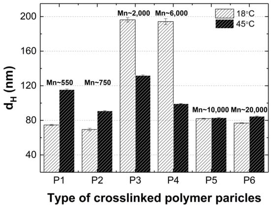 Figure 7A–F display typical intensity-based distribution plots of cross-linked polymer particles P1–P6 in an aqueous dispersion at 18 °C and 45 °C. The size distribution represents the most intense peak out of the five peaks recorded at a specified temperature.