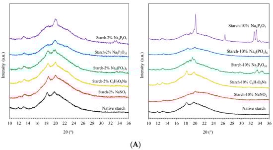 The native starch extrudate displayed diffraction peaks at around 2 θ ≈ 12.0°, 13.0°, 18.2°, and 19.8°, indicating a crystalline arrangement containing A-, CA-, and V-type polymorphs. The presence of the V-polymorph suggests thermal extrusion processing and possible starch retrogradation [3,15,17]. The incorporation of 10% Na4P2O7 and Na5P3O10 resulted in new diffraction peaks at 2 θ ≈ 26.5°, 32.7°, 33.2°, and 34.6°. Additionally, these samples exhibited the highest peak intensity at 2 θ ≈ 19.8°, likely due to the combined effects of high heating during extrusion, plasticization by glycerol, and the specific food preservatives, which may influence chain ordering and recrystallization. In contrast, starch extrudates containing 10% of Na6(PO3)6, C6H7O6Na, and NaNO2 displayed a decrease in peak intensity, suggesting a reduction in crystallinity (Figure 1B). This decrease in crystallinity ranged from 12% to 28% upon incorporation of 2–10% food preservatives. The order of crystallinity for the starch extrudates was as follows: Na4P2O7 (42.57%) > Na5P3O10 (32.45%) > C6H7O6Na (26.00%) > Na6(PO3)6 (21.65%) > NaNO2 (11.07%). The observed decrease in crystallinity with certain food preservatives (Na5P3O10 and Na6(PO3)6) might be attributed to interactions with starch such as crosslinking or acid hydrolysis, respectively [18,19]. These interactions could potentially lead to longer starch conformations and hinder chain alignment, ultimately modifying amylopectin and amylose chain structures [5,7,20].