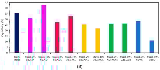 (A) The XRD diffractograms and (B) the degree of crystallinity of native starch and starch extrudates containing 2 and 10% of food preservatives, namely tetrasodium pyrophosphate (Na4P2O7), sodium tripolyphosphate (Na5P3O10), sodium hexametaphosphate (Na6(PO3)6), sodium erythorbate (C6H7O6Na), and sodium nitrite (NaNO2).