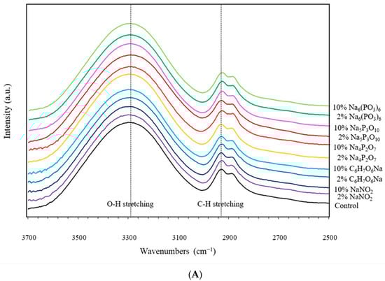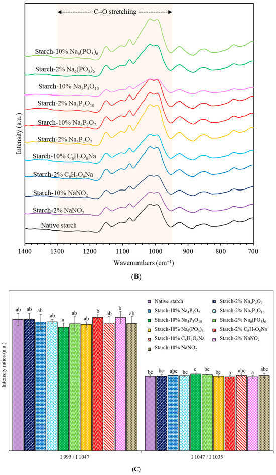 Figure 2C presents the intensity ratios of specific IR peaks for the starch extrudates. The ratio between the intensities at 995 cm−1 and 1047 cm−1 (I995/I1047) reflects the degree of –OH groups at C-6 in the starch unit, using the C–O stretch of C–O–H in starch as a reference [7]. The results showed that increasing concentrations (2–10%) of Na4P2O7, Na5P3O10, Na6(PO3)6, C6H7O6Na, and NaNO2 slightly decreased the –OH bonding, indicating reduced levels of hydrogen bonding. Starch modification possibly occurred through phosphorylation (phosphate preservatives) or acid hydrolysis (C6H7O6Na and NaNO2). The intensity ratio between 1047 cm−1 and 1035 cm−1 reflects the ratio of short-ordered (crystalline) to amorphous structures in the starch, using the amorphous and crystalline regions from the anhydroglucose unit ring in cassava starch as a reference [18,19,20,22]. Increased concentrations of food preservatives (2–10%) led to a higher degree of amorphous structures in the starch extrudates. This suggests that the preservatives penetrated the starch chains, potentially through phosphorylation and acid hydrolysis, disrupting crystallinity during the melting process. These modifications to the starch chain conformation offer potential avenues for further development of functionally tailored starches.