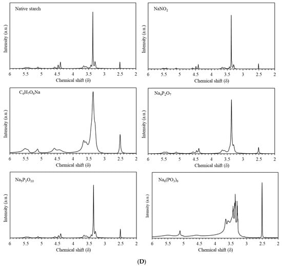 Figure 2D shows the 1H NMR spectra of the native cassava starch and starch extrudates containing various food preservatives. The peak at 2.51 ppm corresponds to the solvent (DMSO-d6) used for the analysis [23]. The chemical shifts observed between 3.21 and 3.89 ppm represent the protons of the hydroxyl groups (HC–OH) at positions 2–6 in the anhydroglucose units [8,23,24]. Additionally, the peak at 4.46 ppm signifies the methylene protons (–CH2OCH2) of glycerol, the plasticizer used during extrusion. The analysis revealed that the incorporation of food preservatives did not alter the positions of the chemical shifts for the H2–H6 protons. However, a slight decrease and broadening of these peaks was observed, possibly due to the disruption of hydrogen bonds and starch chain interactions [16]. The signals between 4.51 and 5.61 ppm are attributed to the equatorial anomeric protons (H1) of the anhydroglucose units. The chemical shifts at around 5.10 ppm and 5.40–5.60 ppm correspond to H1 on the α-(1-6) linkages (branch points) and the α-(1-4) linkages within the anhydroglucose units, respectively [8,25]. Interestingly, these signals displayed a slight downfield shift (Figure S1) in the presence of specific food preservatives. Notably, C6H7O6Na and NaNO2 caused a shift in the α-(1-4) linkage peak, while Na5P3O10, Na6(PO3)6, C6H7O6Na, and NaNO2 all induced a shift in the α-(1-6) linkage peak. These findings suggest that phosphorylation and acid hydrolysis by Na5P3O10, Na6(PO3)6, C6H7O6Na, and NaNO2 might disrupt the α-(1-6) equatorial anomeric protons (H1). Additionally, C6H7O6Na and NaNO2 appear to hydrolyze the starch chains, leading to shorter chains through the disruption of α-(1-4) linkages.