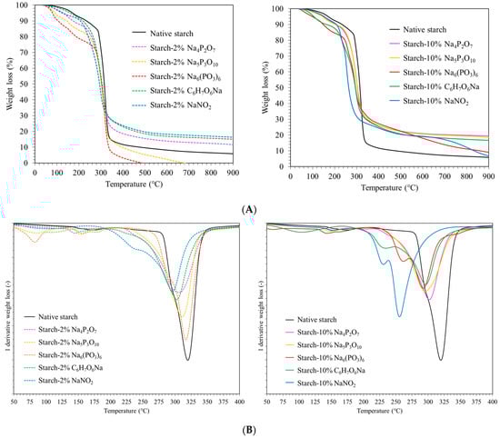 (A) Thermogravimetric curve and (B) 1st derivative TGA of native starch and starch extrudates containing food preservatives, namely tetrasodium pyrophosphate (Na4P2O7), sodium tripolyphosphate (Na5P3O10), sodium hexametaphosphate (Na6(PO3)6), sodium erythorbate (C6H7O6Na), and sodium nitrite (NaNO2).