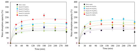 Water absorption is a crucial property of starch-based materials, particularly for applications in food, pharmaceuticals, and biomaterials. Understanding this property can provide valuable insights into the material’s behavior and potential applications. Figure 4 illustrates the water absorption behavior of the native cassava starch and starch-food preservative extrudates. Water absorption capacity reflects the ability of a material to retain water, which is determined by the interactions between starch and water molecules. Several factors influence water absorption, including the composition of the starch, its granular microstructure, long-range crystalline structures, short-range ordered structures, and the presence of hydrophilic groups [28,29]. The results showed that the incorporation of food preservatives generally increased the water absorption capacity of the starch extrudates compared to the native starch. Initially, water absorption increased rapidly, reaching an equilibrium around 60 min. However, prolonged exposure (up to 300 min) led to a decrease in water absorption capacity, possibly due to increased starch dissolution [30]. At 60 min (as shown in Figure S2), starch extrudates containing 2% NaNO2, 2% Na5P3O10, 2% C6H7O6Na, and 2% Na6(PO3)6 exhibited increased water absorption capacity. This can be attributed to the presence of hydrophilic groups (P=O, −OH, and N=O) in these food preservatives, which enhance the overall hydrophilicity of the starch and facilitate water penetration into the structure. Conversely, a 2% Na4P2O7 addition resulted in a decrease in water absorption. This might be due to the increased degree of crystallinity in the starch, hindering water penetration. Interestingly, the water absorption capacity of starch extrudates containing 10% NaNO2 and 10% Na6(PO3)6 showed a slight decrease. This could be related to the higher proportion of short-range ordered structures observed in the FTIR analysis (Figure 2C, I1047/I1035 ratio). These more ordered starch granules might restrict water penetration, causing it to move inwards rather than being readily absorbed. The water absorption behavior of the starch extrudates was significantly influenced by the chemical nature of the food preservatives and the crystallinity of the starch. Hydrophilic groups in food preservatives generally enhanced water absorption, while increased crystallinity could hinder it.