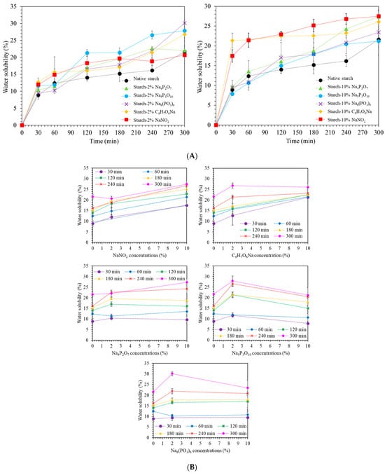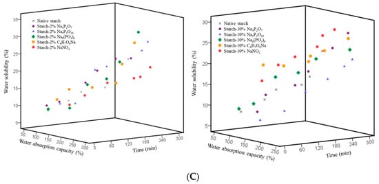 Furthermore, Figure 5C demonstrates the correlation between water absorption capacity, water solubility, and time. It reveals that higher water absorption capacity coincides with increased water solubility. Interestingly, the concentration of phosphate-based preservatives had the least significant impact on solubility. This suggests that these preservatives, even at higher concentrations (10%), might not be present in sufficient quantities to form extensive crosslinks throughout the starch structure. The water solubility of the starch extrudates was significantly influenced by the type and concentration of the incorporated food preservative. NaNO2 and C6H7O6Na exhibited superior solubility-enhancing effects due to their ability to disrupt hydrogen bonding. In addition, starch-NaNO2 systems with the lowest crystallinity exhibit the highest water absorption, and solution capacity can be attributed to crystallinity-amorphous regions, interaction between compound and matrix, hydrogen bonding, and polymer hydrophilicity. Lower crystallinity implies a higher proportion of amorphous regions within the starch structure. These amorphous regions are generally more accessible to water molecules due to their less ordered arrangement, leading to higher water absorption and solution capacity. NaNO2 can interact with both the crystalline and amorphous regions of starch. However, its interaction with the amorphous regions may be more pronounced, leading to increased disruption of the starch structure and enhanced water uptake [7,30,31,32]. Conversely, phosphate-based preservatives, especially at higher concentrations, might form crosslinks within the starch matrix, leading to decreased water solubility. The results suggested that the addition of food preservatives has an effect on water absorption and water solubility, which can be applied in the pharmaceutical, food, and non-food industries due to their different solubility.