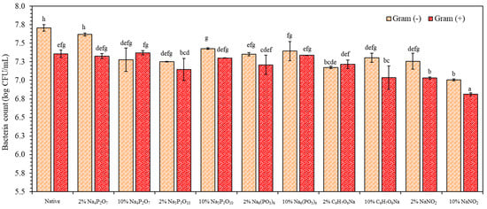 Antimicrobial analysis as total plate count after 24 h of incubation of the native and starch extrudates containing food preservatives, namely tetrasodium pyrophosphate (Na4P2O7), sodium tripolyphosphate (Na5P3O10), sodium hexametaphosphate (Na6(PO3)6), sodium erythorbate (C6H7O6Na), and sodium nitrite (NaNO2), blended PBAT films against Escherichia coli (gram (−)) and Staphylococcus aureus (gram (+)). Different letters (a-h) indicate significant difference (p ≤ 0.05) between food preservatives.