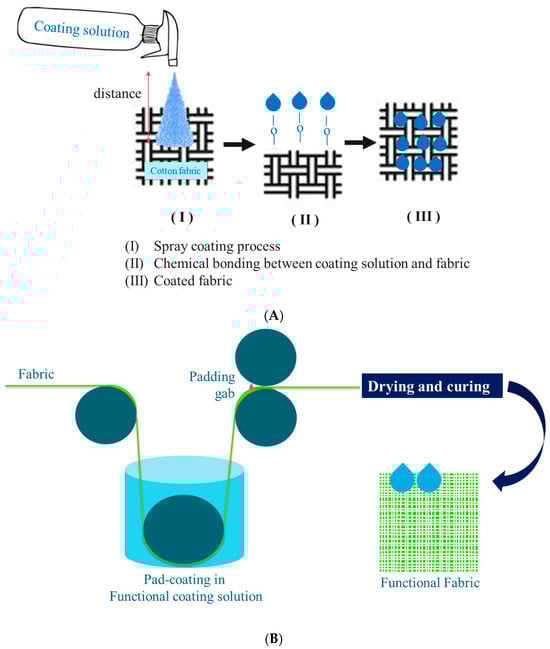 An illustration of (A) spray coating and (B) pad-coating method for fabric.