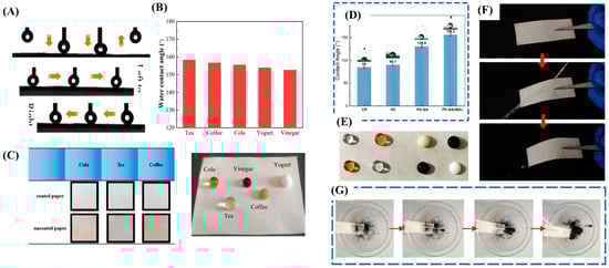 Image of (A) dynamic test of adhesion of water droplets to the surface of soybean residue nanocellulose coated waterproof paper, (B) water contact angles of different droplets on soybean residue nanocellulose coated paper, (C) changes of coated paper and uncoated paper immersed in different liquids and images of liquid drops of waterproof paper in different liquids (Reprinted with permission from Li, Zhou, Jian, Lei, Liu, Zhou, Li, Wang and Zhou [6]), (D) water contact angle of cellulose paper (CP), coated paper (PC), coated paper with stearic acid spraying (PC-SA), coated paper with stearic acid/silicon dioxide spraying (PC-SA/SiO2), (E) the state of different liquids, (F) bouncing with the water column and (G) self-cleaning property (Reprinted with permission from Wei, Shi, Yao, Zhi, Hu, Yan, Shi, Yu and Huang [56]).