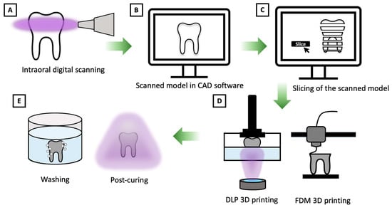 Summary of process procedures. (A) Intraoral digital scanning. (B) Scanned model in CAD software. (C) Cross-sectional slice of the scanned model. (D) 3D printing via (left) digital light processing (DLP) and (right) fused deposition modeling (FDM) techniques. (E) Post-processing treatments: (left) washing and (right) post-curing [1,3].