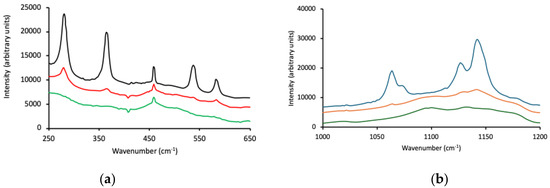 Raman spectra for Pluronic F127 (black line), Pluronic P123 (red line), and Pluronic L121 (green line) within two wavenumber ranges, 250-650 cm−1 (a) and 1000–1200 cm−1 (b).