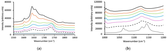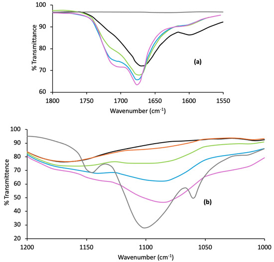 ATR/FTIR was used to confirm the possible polymer interactions within p(MAA)/P F127 IHNs, with a particular focus on the carbonyl region of the spectra (a region that was partially masked by the C=C vibrational peak in Raman spectroscopy). The spectra for the IHNs with wavenumber ranges of 1550–1800 cm−1 and 1000–1200 cm−1 are shown in Figure 4a,b, respectively.