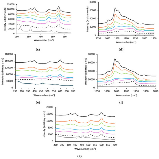 Raman spectra of p(MAA) (black line), Pluronic (grey line), and p(MAA)/Pluronic IHNs (10% w/w red line, 20% w/w green line, 30% w/w blue line, 40% w/w purple line, 50% w/w dashed line) within three wavenumber ranges, 250–650 cm−1, 1000–1200 cm−1, and 1600–1900 cm−1; (a–c) refer to F127, (d,e) P123 and (f,g) L121.