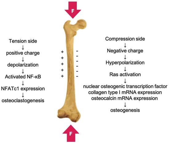 Piezoelectric, ferroelectric, and pyroelectric signals are the bioelectrical signals that occur in a naturally living bone. It has been proven that these factors influence the healing, remodeling, and growth of bone structures [10,11]. Bioelectricity in the living bone was found to be connected with the non-centrosymmetry and piezoelectricity of collagen molecules [12]. The electric field in bones supports cell proliferation and growth. It has been noted that the polarity of the piezoelectric charges depends on the direction of bone deformation or mechanical stress, with positive and negative piezoelectric charges (Figure 1). The piezoelectric constant (d33) of bone has been found to range from 0.7 to 2.3 pC/N−1 [13].
