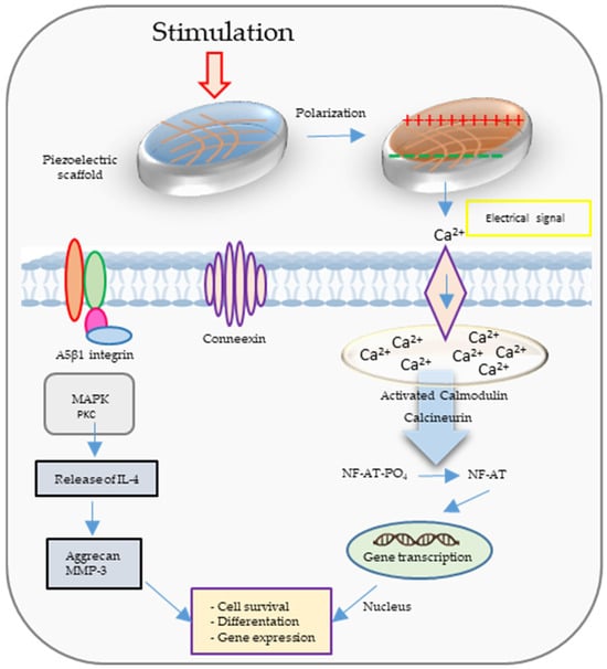 Figure 2 illustrates the calcium ion (Ca2+) signal transduction pathway and several additional signaling pathways triggered by both electrical and mechanical stimulation. When mechanical forces are applied to a piezoelectric scaffold, they generate electrical signals that, in turn, activate voltage-gated Ca2+ channels. This leads to an increase in intracellular Ca2+ concentration, subsequently initiating the activation of calcium-modulated protein (calmodulin). Calmodulin, in turn, triggers the activation of calcineurin, a calcium- and calmodulin-dependent serine/threonine protein phosphatase. Once activated, calcineurin dephosphorylates NF-AT (nuclear factor of activated T-cells), causing it to translocate to the nucleus, where it collaborates with other associated proteins as transcription factors. Furthermore, mechanical stimulation itself can activate mechanoreceptors within the cell membrane, ultimately initiating the activation of protein kinase C (PKC) and mitogen-activated protein kinase (MAPK) signaling cascades. These cascades contribute to the synthesis of proteoglycan and the inhibition of interleukin-1 (IL-1), which is responsible for the degradation of proteoglycan [22].