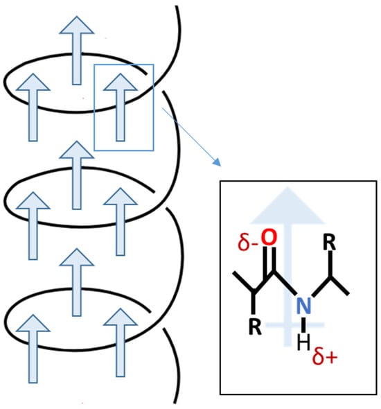In 1940, Martin [27,28] observed the initial manifestation of biological piezoelectricity. This occurred during the discovery of electric potentials emanating from compressed wool enclosed in shellac between two brass plates. Mammalian hair, wool, horn, and hoof primarily consist of α-keratin, characterized by a spiral α-helix structure [29]. The piezoelectric properties of these tissues stem from the orderly arrangement of α-helices, promoting inherent polarization [30]. The α-helix, a right-handed coil, achieves stability through hydrogen bonds between the amine and carbonyl groups. As depicted in Figure 3, the helical structure aligns amino acid dipoles, resulting in a substantial and enduring polarization [31].