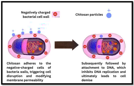The antibacterial mechanism of chitosan particles involves disrupting the bacterial cell wall, binding to bacterial DNA, and inhibiting DNA replication, ultimately resulting in bacterial cell death. Reprinted from ref. [57].