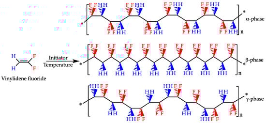Polymerization of the vinylidene flyuoride monomer with various PVDF chain conformations of α-phase (non-polar) and β- and γ-phases (polar). Reprinted From Ref. [91].