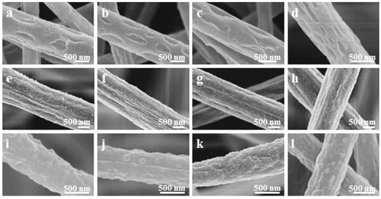 SEM microstructures with PVDF electrospun fibers’ morphology with various applied voltages during the electrospinning process; (a,e,i)—6 kV; (b,f,j)—12 kV; (c,g,k)—18 kV; (d,h,l)—24 kV. Reprinted with permission from ref. [96]. Copyright 2019, IOP Publishing Group.