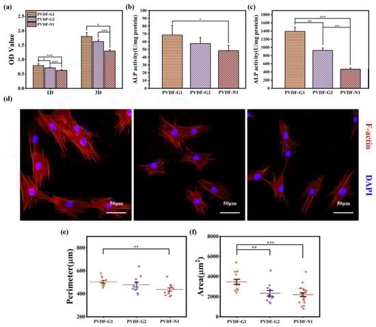 Selected parameters of scaffolds. (a) The adhesion (day 1) proliferation (day 3) behaviors of MSCs on PVDF-TrFE; (b,c) ALP activity of MSCs using PVDF-TrFE after 7 and 14 days. (d) Microstructures of CLSM of MSCs on PVDF-TrFE after 3 days. (e,f) Cytomorphometric tests of MSCs on PVDF-TrFE for 3 days. Reproduced with permission from the publisher, reference [112].